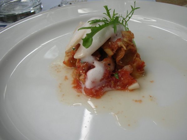 第三道菜"新鮮乳酪番茄義式沙拉佐羅勒松子醬",光看就覺得這道菜師傅下了不少功夫,一個小小的聖女小番茄切成兩半,還在那小小的面積上面塗了半球的乳酪;一口直接吃下去,恩....番茄的清爽加上義式乳酪也是淡淡而不過重的略濃郁滋味,真是不錯吃,三兩下就吃完,回頭一看其他人,@@!!!!!!其他人還有沾旁邊的醬汁..................,看了一下已經沒了番茄與乳酪只剩青色醬汁的空盤子,嗚><~~~~~,試著用叉子沾了點醬汁嚐嚐,一點點的醬汁滋味第一瞬間就佔滿了你的味覺,我嚐到醬汁的一瞬間我就知道我錯大了,我光用想像的就想的出來,沾滿了羅勒松子醬的乳酪番茄,剛送進嘴裡就被羅勒松子醬的強烈滋味所佔據,當咬下蕃茄所溢出的清爽汁液會因羅勒松子醬滋味而被強烈放大,隨之而來的則是義式乳酪爽口而不過重的乳酪香味..........,我真的錯大了