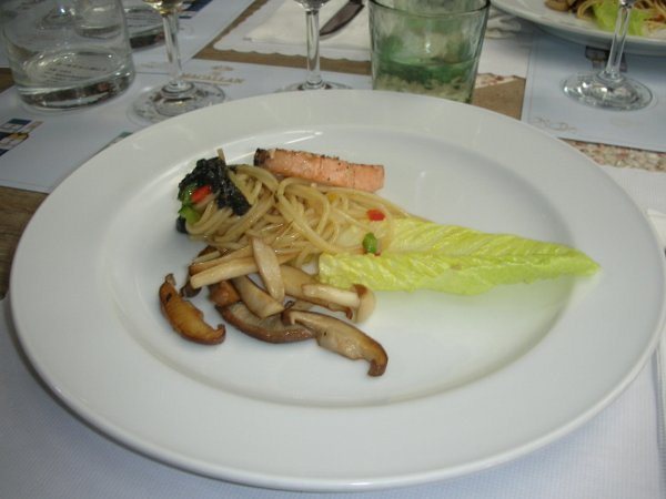 最後一道前菜(@@!還在前菜ㄚ!!!!。謎之音:主菜還沒出來都算前菜啦XDXDXDXD)香煎鮭魚佐松露義大利麵,這一道菜講究的是本身食材的鮮美,香煎出來還粉嫩嫩的鮭魚,香甜美味的菇類,以及煮的稍硬的主角義大利麵,因稍硬卻顯出其嚼勁美味,久嚼之下從嘴裡慢慢散發出的麵粉香味,鋪盤的生菜可保持嘴裡的清爽,廚師你太棒了,愛死你了