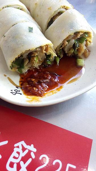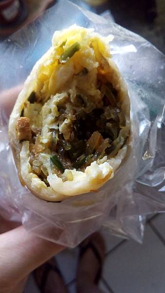 韭菜蛋餅餡料相當豐富,整個就是韭菜盒子的餡料,吃起來很過癮可是蛋皮吃起來太過鬆軟,