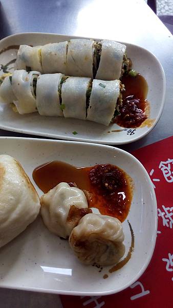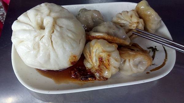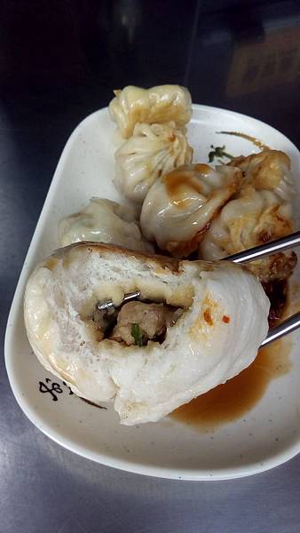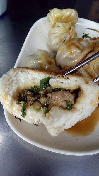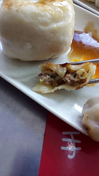 水煎包吃到後面皮有點破掉掉了點餡料,不可以浪費拌點辣椒醬夾回去一口吃下去,