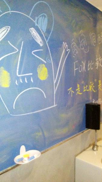 但很有意思的是它把牆面整個用成塗鴉牆,牆上還留著幾種顏色的粉筆讓客人塗鴉,